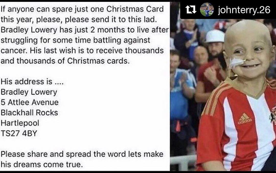 پیامی که جان تری کاپیتان پیشین آبی پوشان پایتخت انگلیس برای یاری هرچه بیشتر بردلی لوور، کودک سرطانی منتشر کرده است، بدین شرح است: