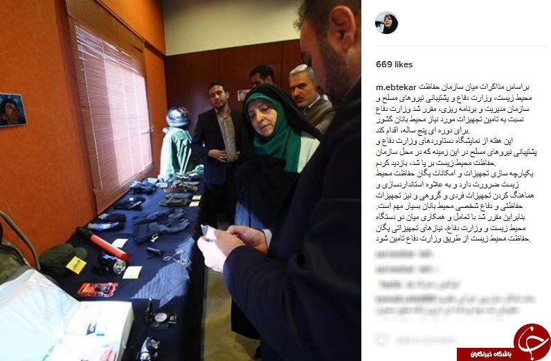 وی در صفحه اینستاگرام خود نوشت: "براساس مذاکرات میان سازمان حفاظت محیط زیست، وزارت دفاع و پشتیبانی نیروهای مسلح و سازمان مدیریت و برنامه ریزی، مقرر شد وزارت دفاع نسبت به تامین تجهیزات مورد نیاز محیط بانان کشور برای دوره ای پنج ساله، اقدام کند. این هفته از نمایشگاه دستاوردهای وزارت دفاع و پشتیبانی نیروهای مسلح در این زمینه که در محل سازمان حفاظت محیط زیست بر پا شد، بازدید کردم. یکپارچه سازی تجهیزات و امکانات یگان حفاظت محیط زیست ضرورت دارد و به علاوه استانداردسازی و هماهنگ کردن تجهیزات فردی و گروهی و نیز تجهیزات حفاظتی و دفاع شخصی محیط بانان بسیار مهم است. بنابراین مقرر شد با تعامل و همکاری میان دو دستگاه محیط زیست و وزارت دفاع، نیازهای تجهیزاتی یگان حفاظت محیط زیست از طریق وزارت دفاع تامین شود."
