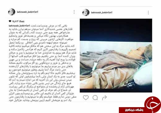 به گزارش زاهدانه، بهنوش بختیاری ضمن انتشار عکسی از خود روی تخت بیمارستان در صفحه اینستاگرامش نوشت: «بلایی که در عرض چند ساعت... تحت فشارهای عصبی شدید آدما میتونن سر هم بیارن... شاید یه عذرخواهی همه چیز رو درست کنه... کسانی که به عنوان همکار بهشون نگاه میکنی و بعد به خاطر غرور و تحکیم موقعیت، کارهایی ازشون میبینی که روح و جسمت کم میاره و نمیتونه حجم این همه نامردی و بیاخلاقی رو یک جا تحمل کنه...»