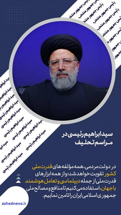 زاهدنیوز، آیت الله سید ابراهیم رئیسی رئیس جمهور عصر امروز ۱۴ مردادماه ۱۴۰۰ در مراسم تحلیف ریاست جمهوری گفت: دولتِ مردمی، دولتِ وفاق ملی است. در دولت مردمی، جناحهای سیاسی، دستهبندیهای قومی و مذهبی و گروهی رنگ میبازد و همهی مردم دست در دست یکدیگر برای تحقق ایران قوی ذیل پرچم مقدس جمهوری اسلامی همپیمان میشوند.