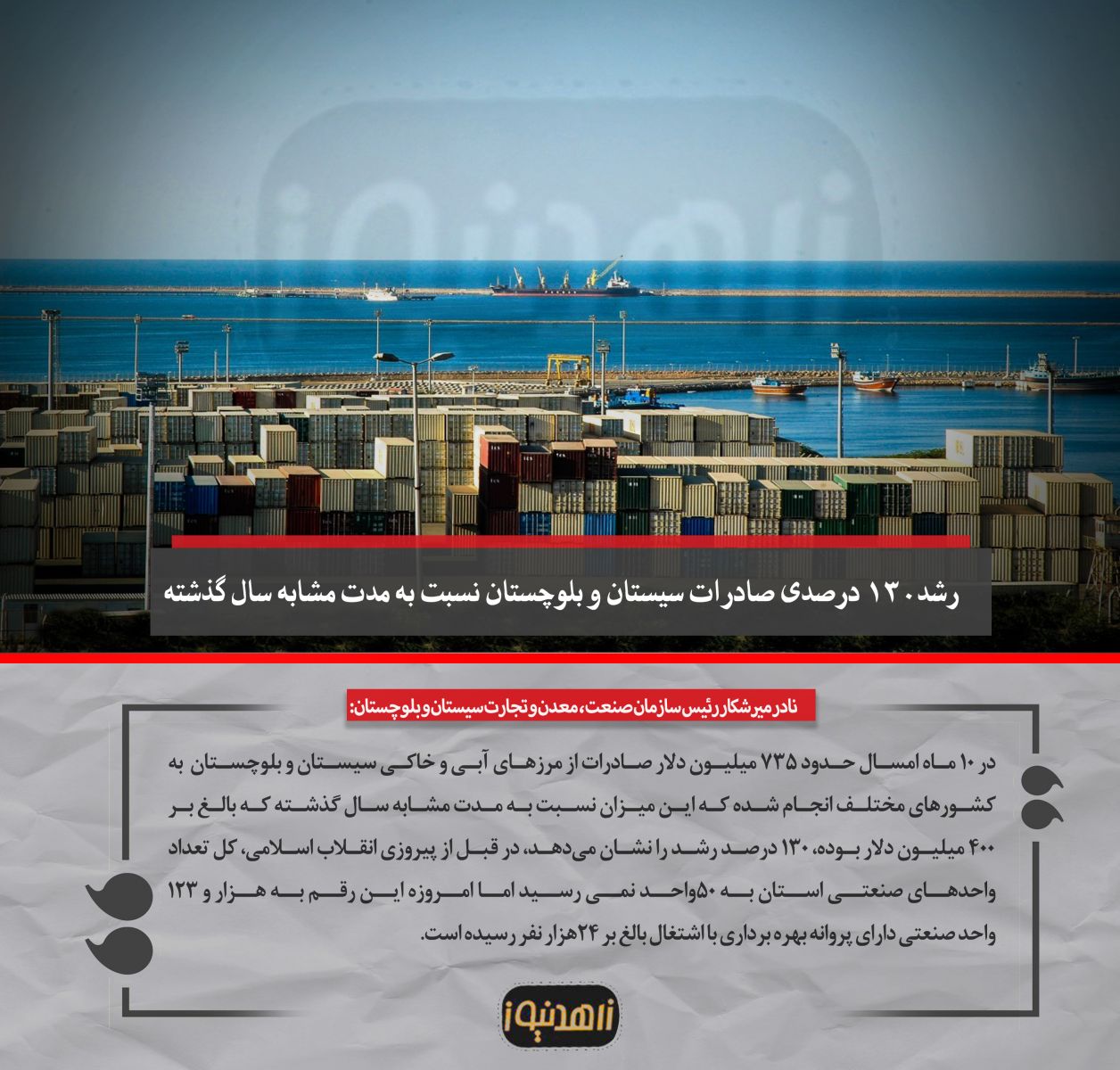 رئیس سازمان صنعت، معدن و تجارت سیستان و بلوچستان گفت: در طی ده ماه امسال، میزان صادرات از سیستان و بلوچستان رشدی 130 درصدی نسبت به مدت مشابه سال گذشته داشته است.