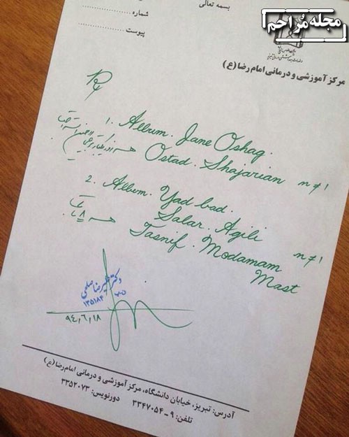 به گزارش زاهدانه ، تصویری واقعی از نسخه یک پزشک تبریزی که برای بیمار خود آلبوم‌های «جان عشاق» شجریان و تصنیف «مدامم مست» از آلبوم «یاد باد» سالار عقیلی را تجویز کرده است.