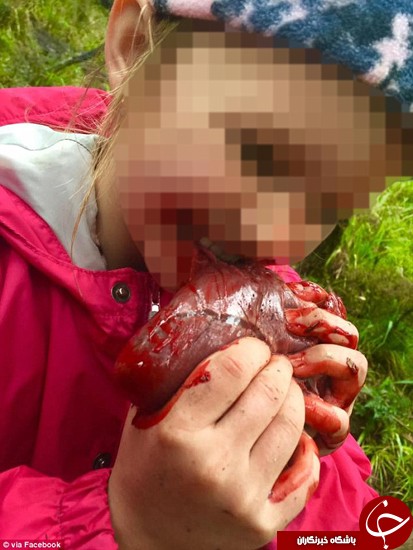 این دختر در این عکس قلب یک گوزن را به صورت خام میخورد و طبق نوشتهای که زیر پست است این اولین شکار گوزن این دختر است.