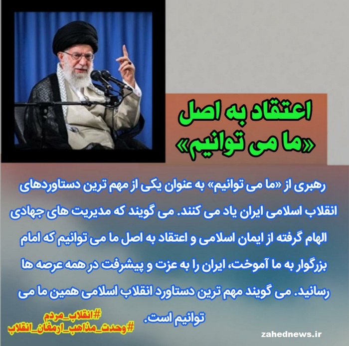 زاهدنیوز، رهبرمعظم انقلاب از «ما میتوانیم» بهعنوان یکی از مهمترین دستاوردهای انقلاب اسلامی ایران یاد میکنند و میگویند که مدیریتهای جهادی الهامگرفته از ایمان اسلامی و اعتقاد به اصل ما میتوانیم که امام بزرگوار به ما آموخت، ایران را به عزت و پیشرفت در همه عرصهها رسانید. میگویند مهمترین دستاورد انقلاب اسلامی همین ما میتوانیم است.