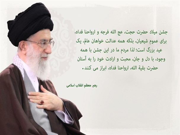 جشن میلاد حضرت حجت، عج الله فرجه و ارواحنا فداه، برای عموم شیعیان، بلکه همه عدالت خواهان عالم، یک عید بزرگ است؛ لذا مردم ما در این جشن با همه وجود، با دل و جان، محبت و ارادت خود را به آستان حضرت بقیه الله، ارواحنا فداه، ابراز می کنند.
