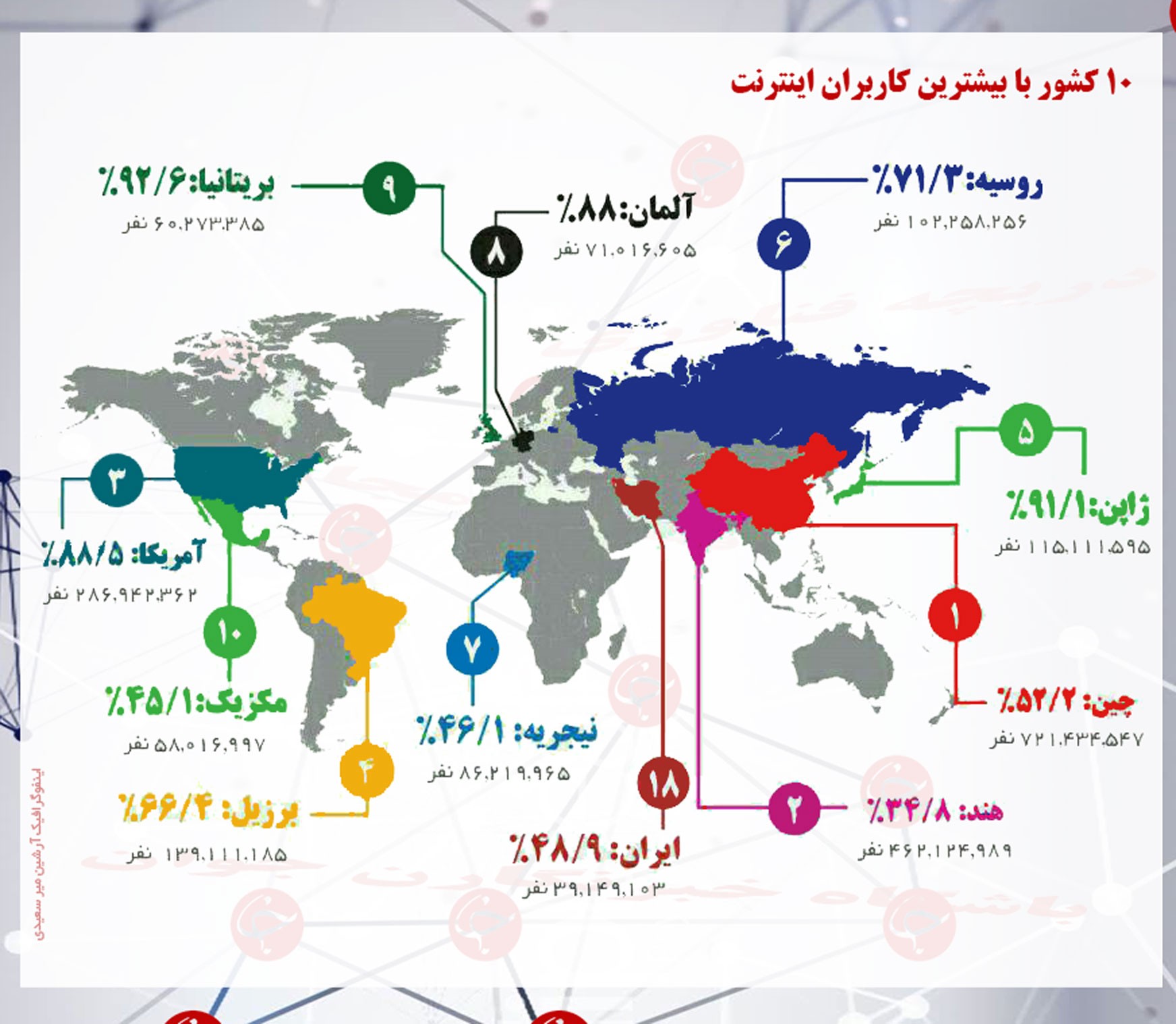 ده کشور برتر در تعداد کاربران اینترنت، رتبه ایران و همچنین درصد کاربران این کشورها به کل جمعیتشان را در قالب اینفوگرافی ارائه کردهایم.