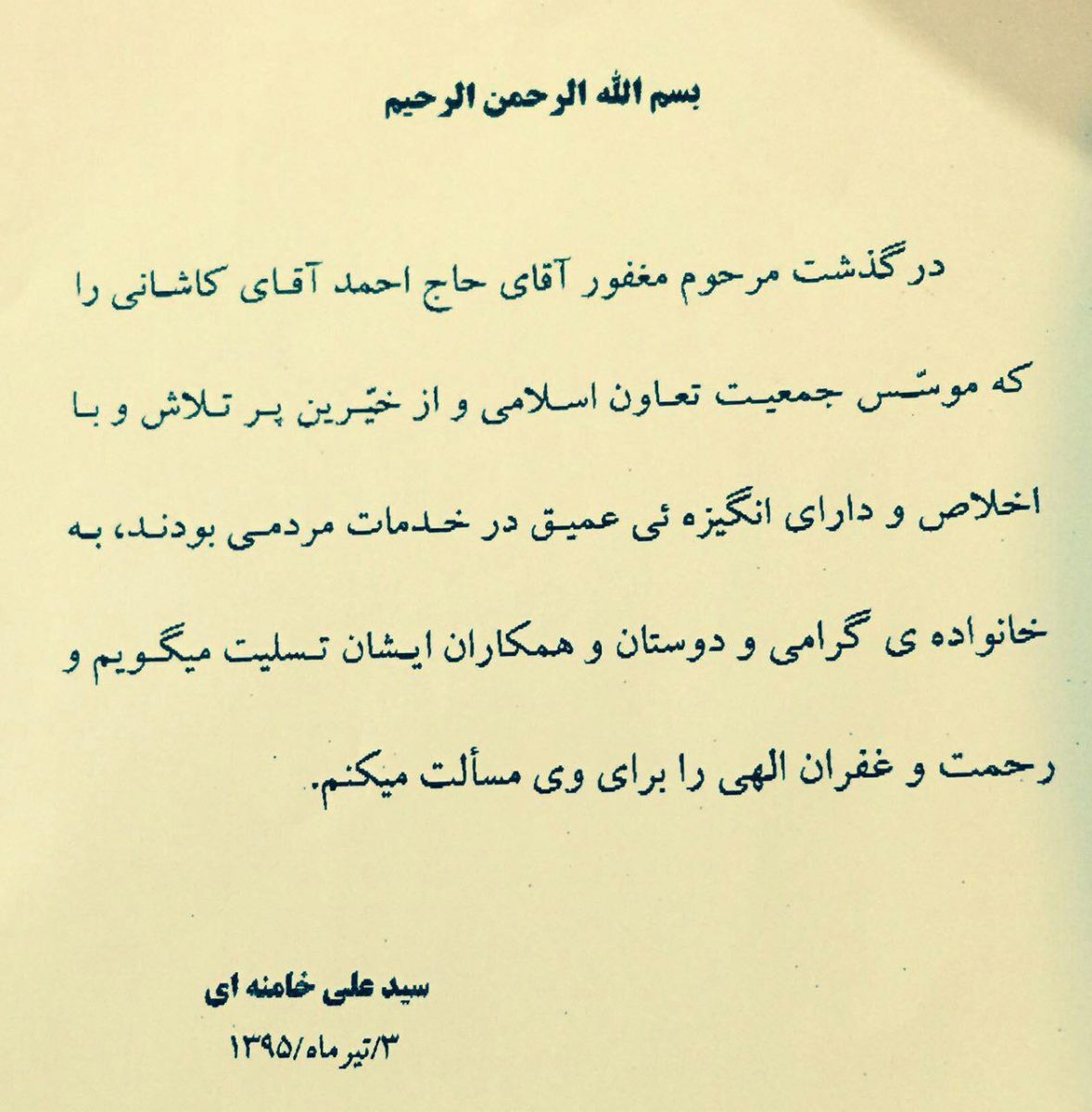 زاهدانه با اشاره به درگذشت شخصیت برجسته کشوری در امورات خیر اظهار داشت: حاج احمد کاشانی وحید یکی از بزرگترین تجار تهران بود که قریب به چهار دهه از عمر خود را بنا به خواسته مقام معظم رهبری صرف خدمت رسانی به مناطق محروم به ویژه در سیستان وبلوچستان کرد.