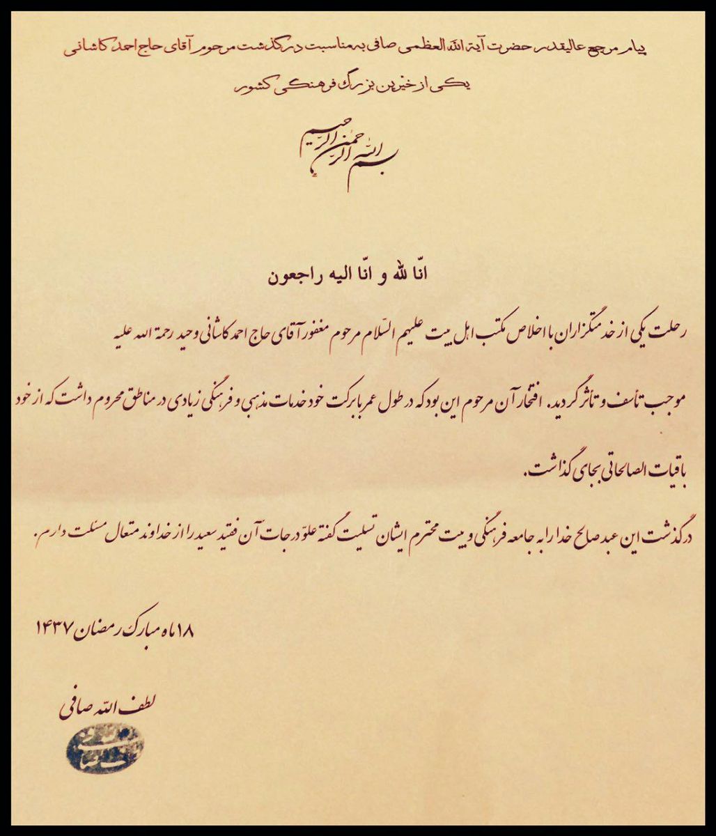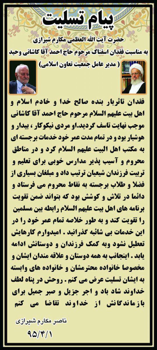 الوندی فرد با بیان اینکه حاج احمد کاشانی وحید لقب سردارعرصه تعلیم و تربیت را بخود اختصاص داده است، بیان کرد: وی در پانزدهم ماه رمضان امسال در سن88 سالگی به رحمت الهی شتافت که در این راستا مقام معظم رهبری، حضرت آیت الله مکارم شیرازی، حضرت آیت الله صافی گلپایگانی، حضرت آیت الله سیستانی و غیره پیام تسلیت خود را به خانواده وی اعلام کردند.