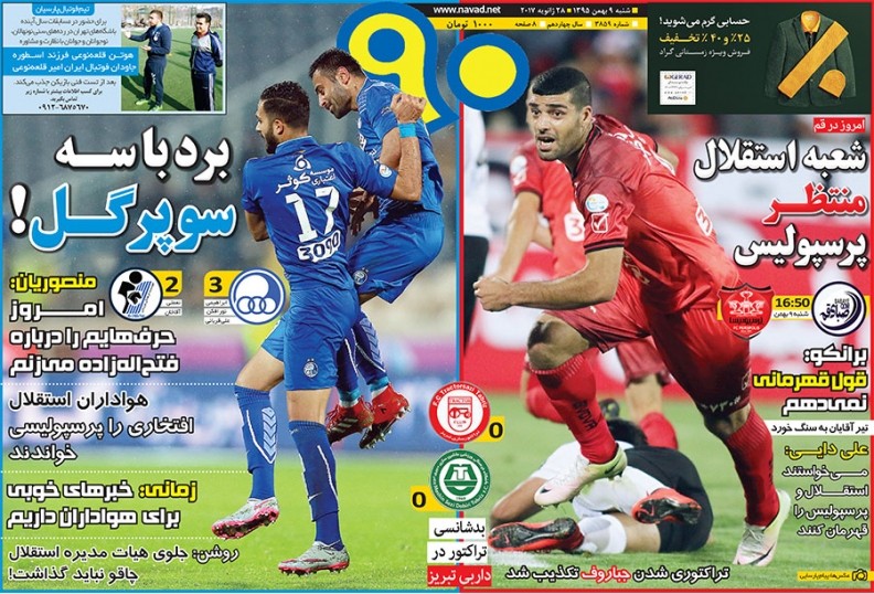 تصاویر نیمصفحه روزنامههای ورزشی نهم بهمن به مسائل مختلف ورزشی به ویژه فوتبال اختصاص دارد.
