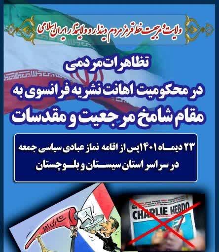 رئیس شورای هماهنگی تبلیغات اسلامی سیستان و بلوچستان گفت: تظاهرات و اجتماع مردمی سراسر استان سیستان و بلوچستان، فردا ۲۳ دی ماه پس از اقامه نماز جمعه در محکومیت اقدام توهینآمیز نشریه فرانسوی به مقام شامخ مرجعیت و مقدسات انجام می شود.