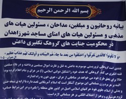 ما روحانیون و مبلغین، مداحان، مسئولان هیئتهای مذهبی و مسئولان هیئتهای امنای مساجد شهر زاهدان و همچنین نمایندگان بانوان استان سیستان و بلوچستان به پیروی از امام خود اعلام میداریم: ما اینها را دشمنان اصلی نمیدانیم، دسمن اصلی، آن کسی است که اینها را تحریک میکند و پول در اختیارشان میگذارد.