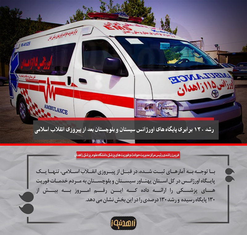 زاهدنیوز، فریبرز راشدی در گفت و گو با زاهدنیوز، افزود: با توجه به آمارهای ثبت شده، در قبل از پیروزی انقلاب اسلامی، تنها یک پایگاه اورژانس در کل استان پهناور سیستان و بلوچستان به مردم خدمات فوریت های پزشکی را ارائه داده که این رقم امروز به بیش از 130 پایگاه رسیده که رشد 130 درصدی را در این بخش نشان می دهد.