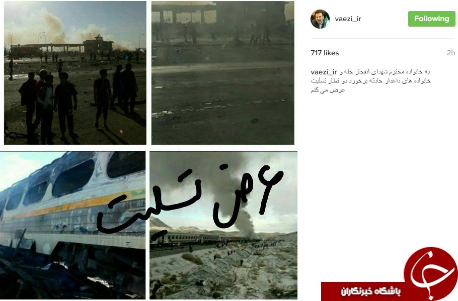 محمود واعظی نوشت:"به خانواده محترم شهدای انفجار حله و خانواده های داغدار حادثه برخورد دو قطار تسلیت عرض می کنم"