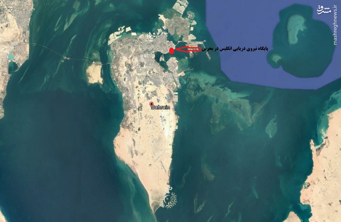 نقطه قرمز بر روی تصویر، پایگاه نیروی دریایی انگلیس در بحرین را نشان میدهد