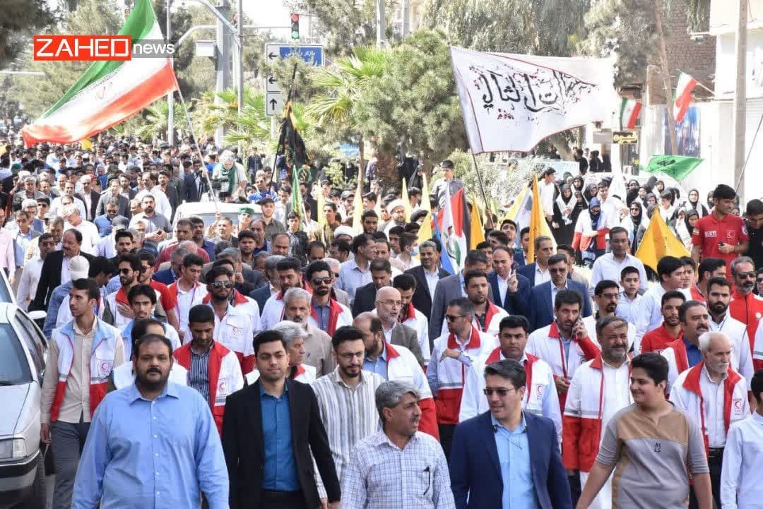 مردم زاهدان صبح چهارشنبه ۲۷ فروردینماه ۱۴۰۴ با حضور پرشور در راهپیمایی حمایت از مردم مظلوم فلسطین حمایت کردند.