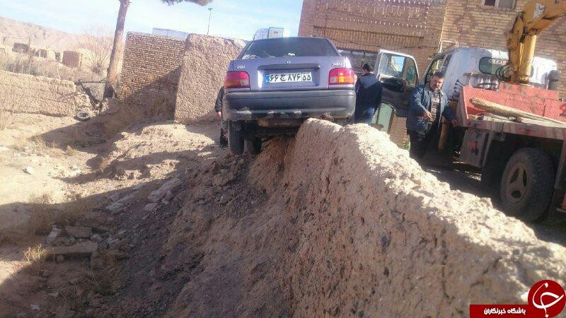 در تصویر زیر، این خودرو را در حالی مشاهده می کنید که سر از دیواری در روستای نسران از توابع بخش مرکزی شهرستان نطنز در استان اصفهان در آورده است.