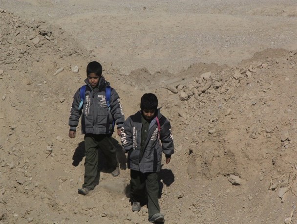 " دو دانش آموز مدرسه ابتدایی شهید رجب بیکی شهرک بوستان دامغان ، هر روز مسیر پنج کیلومتری خانه تا مدرسه را با پای پیاده طی می کنند . "