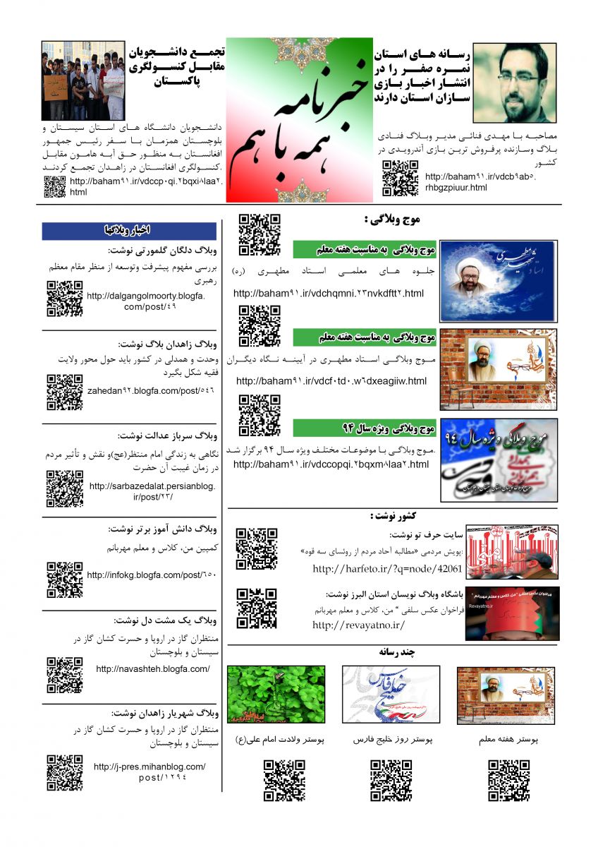 زاهدانه،اولین خبرنامه الکترونیکی سایت همه با هم با توجه به موضوعات درج شده در این سایت منتشر شد. این خبرنامه که از تیتر و لید خبر های سایت انتخاب شده است از 2 شیوه میتوانید متن کامل خبر را مشاهده نمائید، شیوه اول از طریق وارد نمودن لینک خبر که در زیر هر خبر آورده شده است، شیوه دوم از طریق QR کد که با دوربین موبایل های هوشمند میتوانید خبر را مشاهده نمائید.