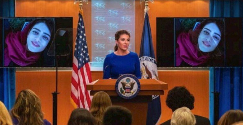 بعد از نقش آفرینی های گسترده منافقین و سلطنت طلبها در ماجرای دروغ دختر آبی، امروز سخنگوی وزارت خارجه آمريكا نیز نشست خبری خود را همراه با تصاویری بزرگ از سحر خدایاری برگزار کرد