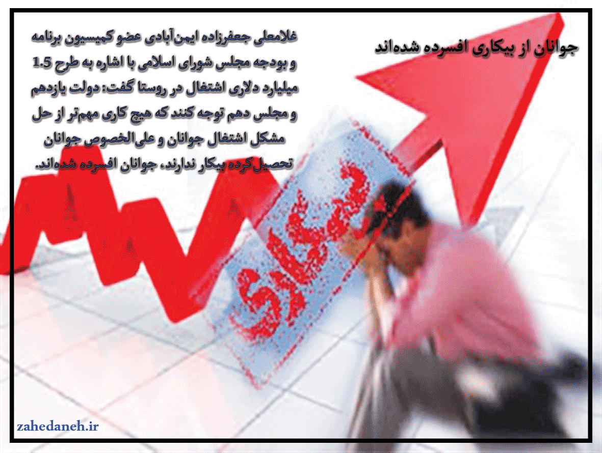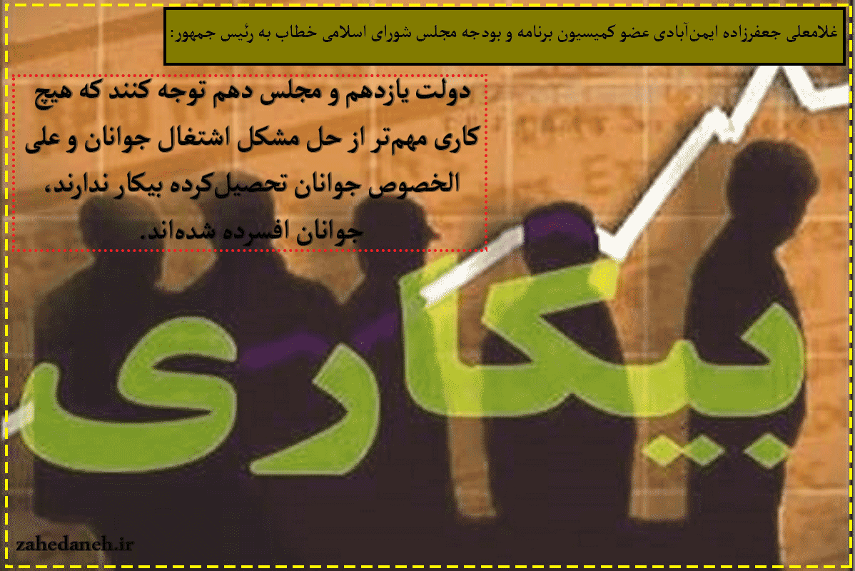زاهدانه، غلامعلی جعفرزاده ایمنآبادی عضو کمیسیون برنامه و بودجه مجلس شورای اسلامی خطاب به رئیس جمهور گفت: دولت یازدهم و مجلس دهم توجه کنند که هیچ کاری مهمتر از حل مشکل اشتغال جوانان و علیالخصوص جوانان تحصیلکرده بیکار ندارند، جوانان افسرده شدهاند.