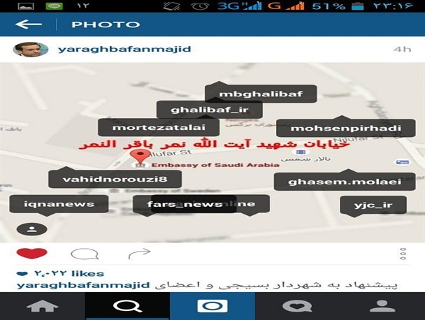 به گزارش زاهدانه به نقل از رودآور، مجید یراقبافان مجری رادیو و تلویزیون در صفحه اینستاگرام خود گفت: پیشنهاد به شهردار بسیجی و اعضای ولایی شورای اسلامی شهر تهران : نام خیابانی را که سفارت عربستان سعودی در آن قرار دارد به نام " شهید شیخ نمر باقر النمر " تغییر دهید...