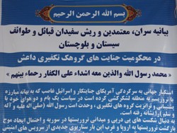 ما سران، معتمدان و ریشسفیدان قبائل و طوایف سیستان و بلوچستان همانند طوایف و عشایر مسلمان و غیور عراق و سوریه ضمن محکومیت جنایتهای این گروهک متحجر اعلام میداریم هر گونه تفکر و اقدام تکفیری که منجر به تخریب چهره اسلام عزیز و هتک حرمت مسلمانان اعم از شیعه و سنی در هر کجای دنیا شود را به شدت محکوم کرده و با وحدت اسلامی و همزیستی مسالمتآمیز در سایه احکام نورانی اسلام بر بندهای ذیل تاکید میکنیم.