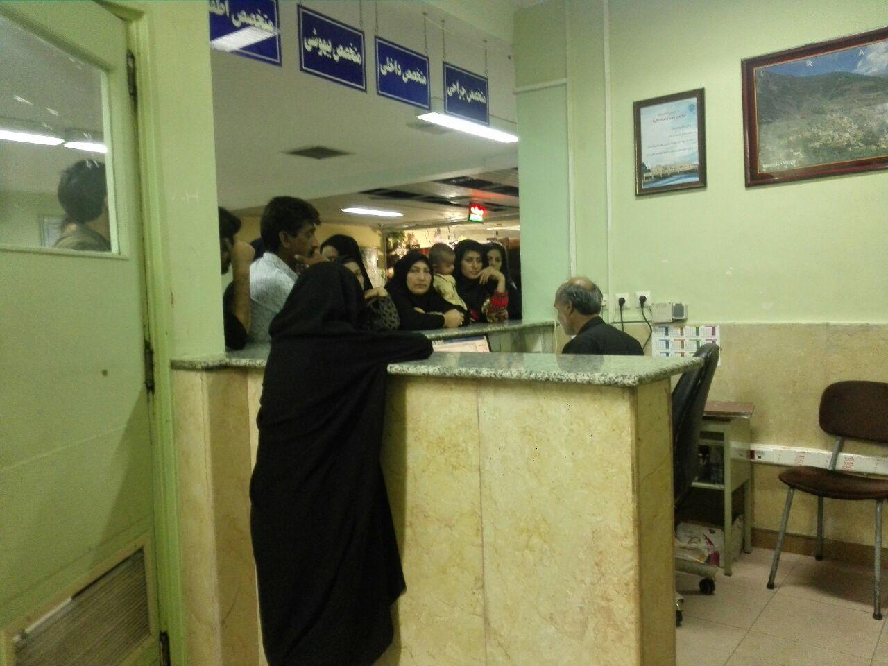 خبرنگار ما می گوید: از ساعت 15 تا 17:45 دقیقه معطل مانده تا نزد دکتر برویم و در قسمت آزمایشگاه نیز با کلی معطلی در جوابمان می گویند "بروید روز جمعه از ساعت 14 تا 19 نوبت بگیرید شنبه صبح بیایید تا کارتان انجام شود".