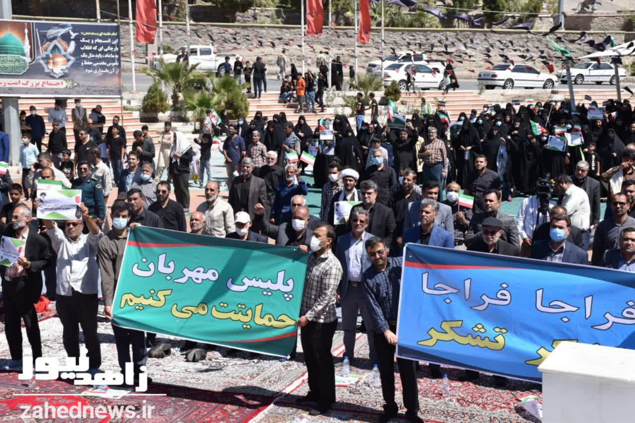 اجتماع بزرگ امت رسول الله (ص) با حضور اقشار مختلف مردم در حمایت از قرآن و پرچم کشورمان در میدان امام حسین(ع) صبح امروز در زاهدان برگزار شد.