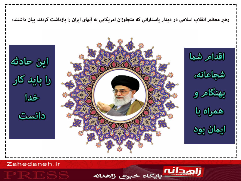 به گزارش زاهدانه، حضرت آیت الله خامنه‌ای رهبر معظم انقلاب اسلامی در دیدار با پاسداران جوان نیروی دریایی سپاه پاسداران انقلاب اسلامی که با شجاعت در مقابل ورود نظامیان امریکایی به آبهای جمهوری اسلامی ایران اقدام و متجاوزان را بازداشت کرده بودند، اظهار داشتند: کار شما بسیار عالی، جالب و بهنگام بود و در واقع باید این حادثه را کار خدا دانست که آمریکایی ها را به آبهای ما کشاند تا با اقدام بهنگام شما، آنگونه با دستهایی که بر سر گذاشته بودند، بازداشت شوند.
