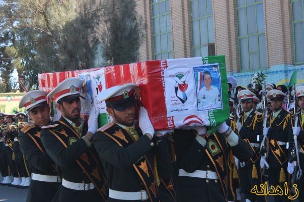ظهر امروز پیکر مطهر شهید استوار دوم امین مرادی بر روی دستان شهید پرور مردم زاهدان به سمت گلزار شهدای این شهرستان تشییع شد.